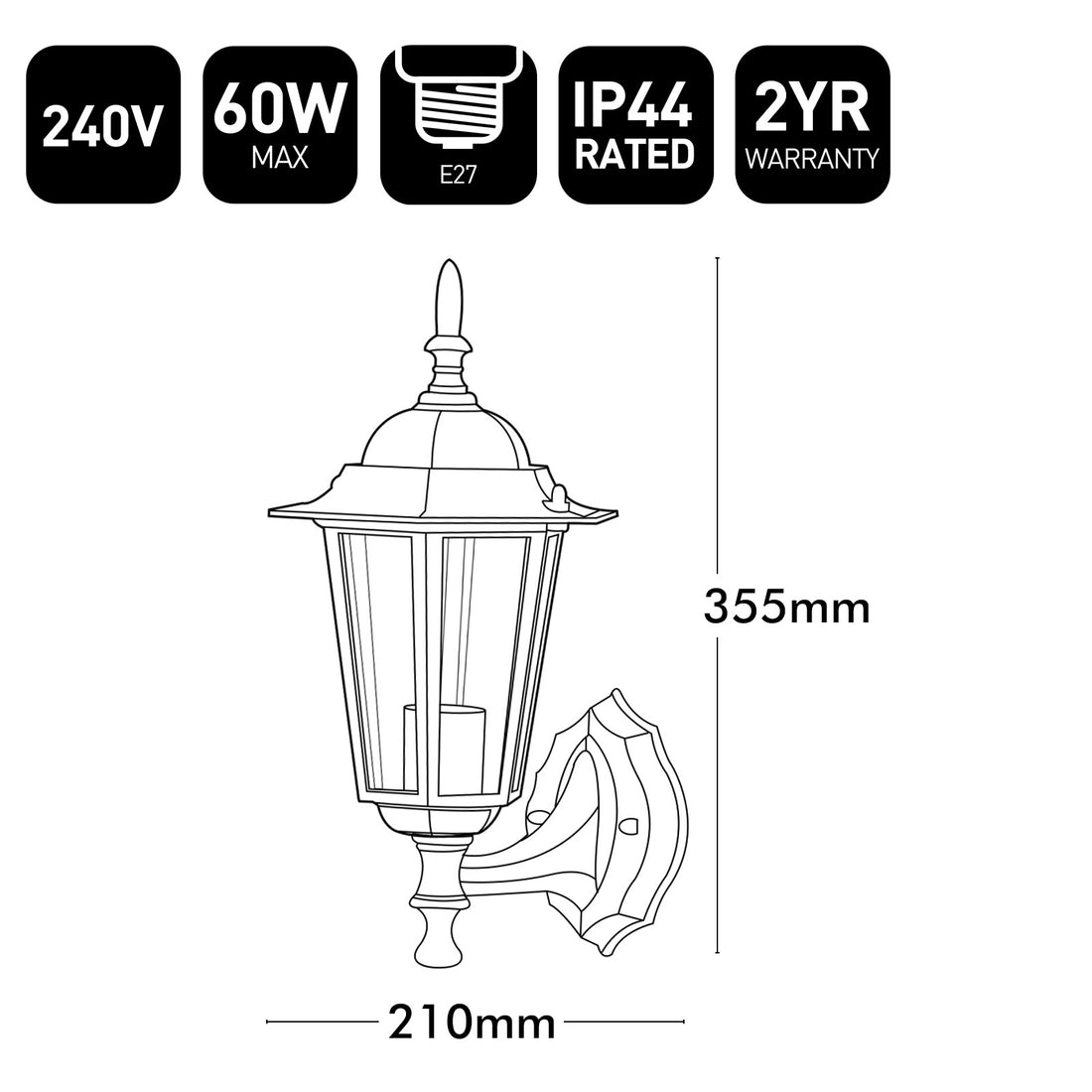 Modern-styled exterior coach wall light made from durable powder-coated diecast aluminium with six clear bevelled glass panels