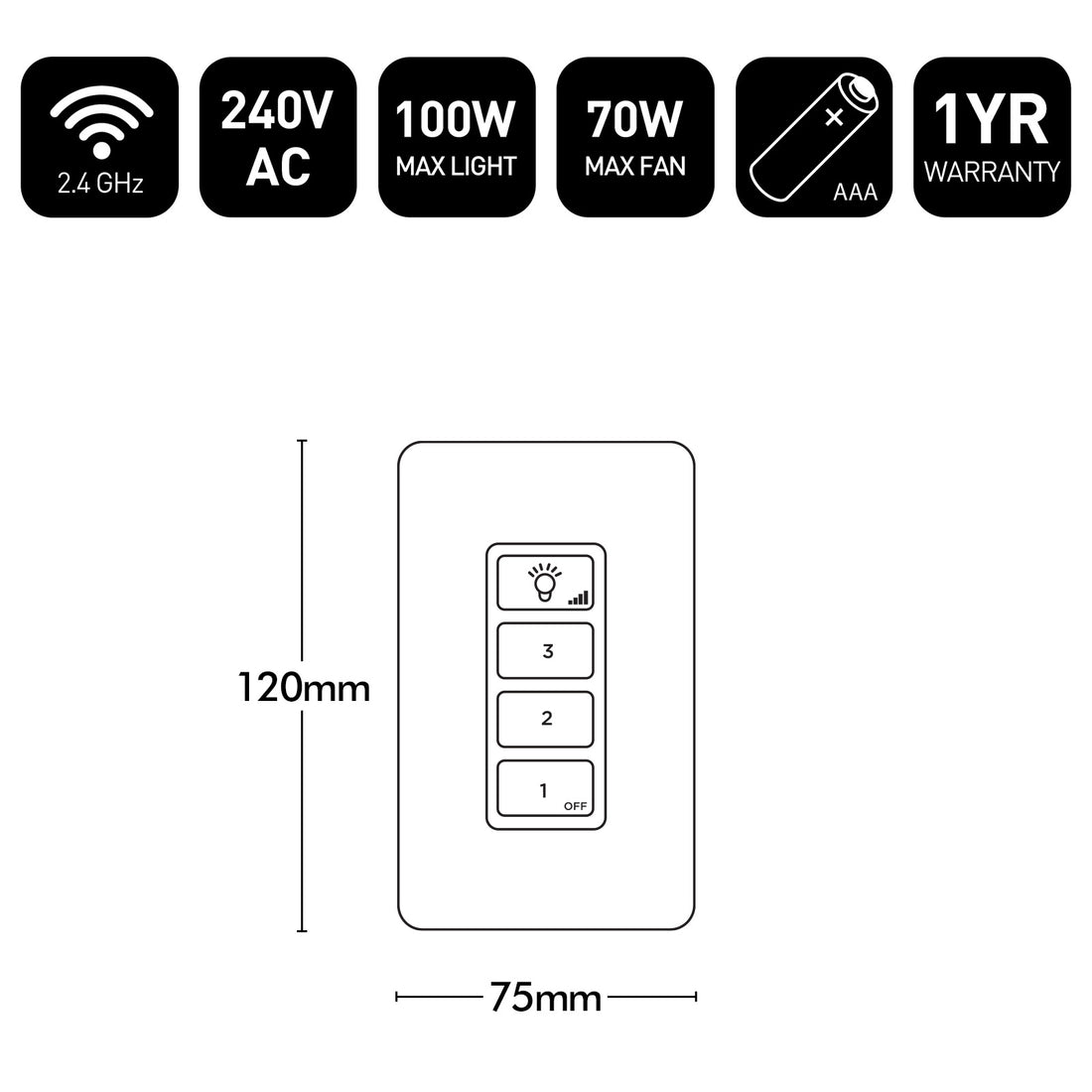 - Includes 3-speed with light function wireless operated wall control with batteries (2xAAA)